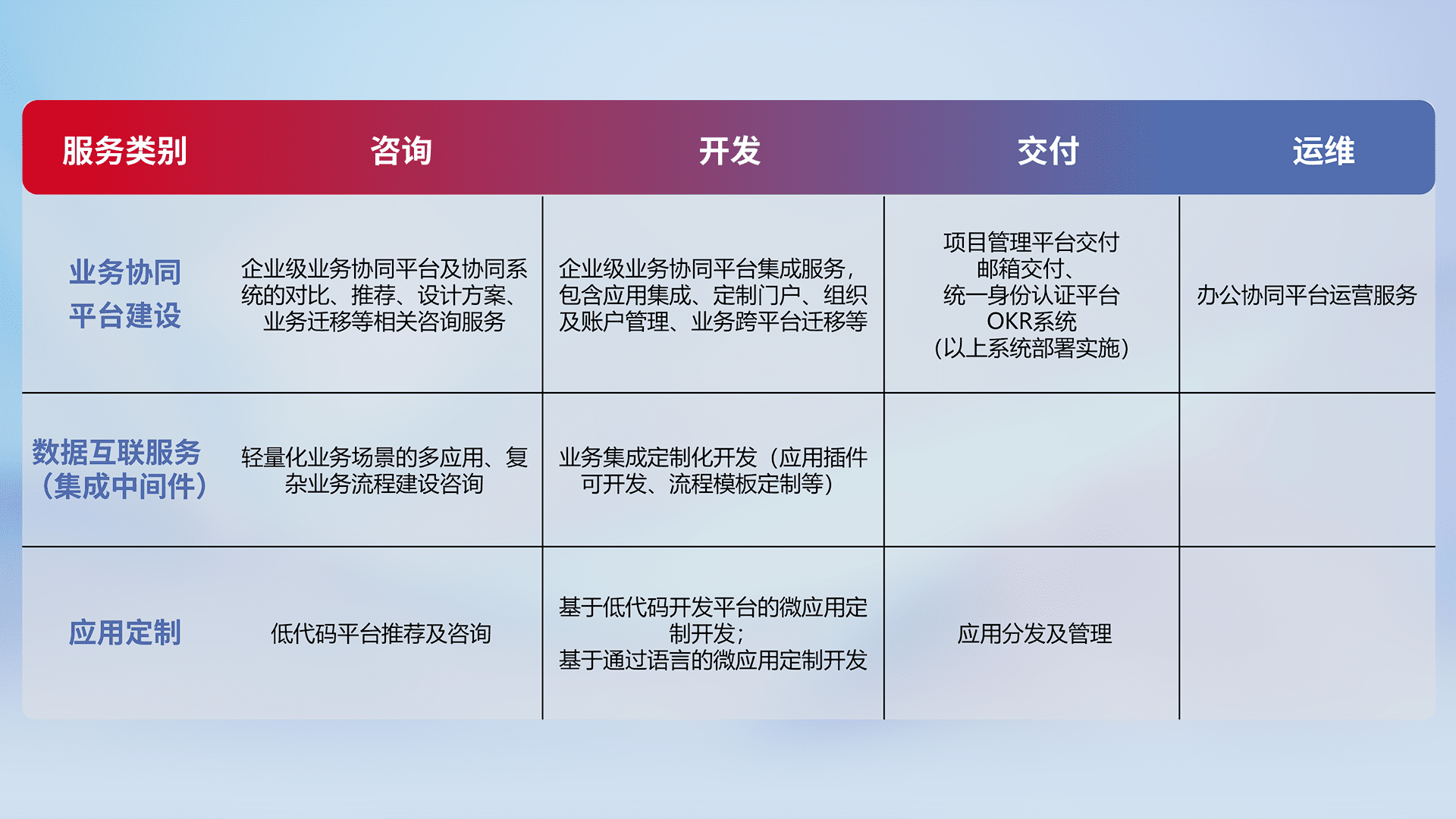 针对钉钉、、、、企微、、、IDaas等平台级产品提供产品的规划、、方案、、、交付、、、、定制化开发等服务,,,,实现如统一协同办公、、、、智能客户服务、、、、混合会议管理、、、、智能数据查询、、、等业务场景,,,,实现数字化转型。。