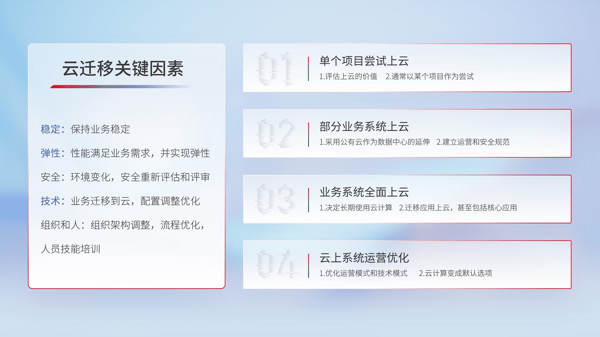 结合实际业务,,,,从规划设计、、、云平台选型、、、云原生改造、、、数据迁移、、、、集成交付,,,迁移全过程为客户识别最佳上云路径,,,做好风险识别管理,,,,设计网络架构、、、身份权限、、、、安全审计合规、、、、操作审计、、、日志审计、、、、监控告警策略、、、、多站点容灾设计等,,对云上基础设施进行整体规划,,,,提升IT治理水平,,,,以满足弹性、、、、高可用、、高性能的需求。。
