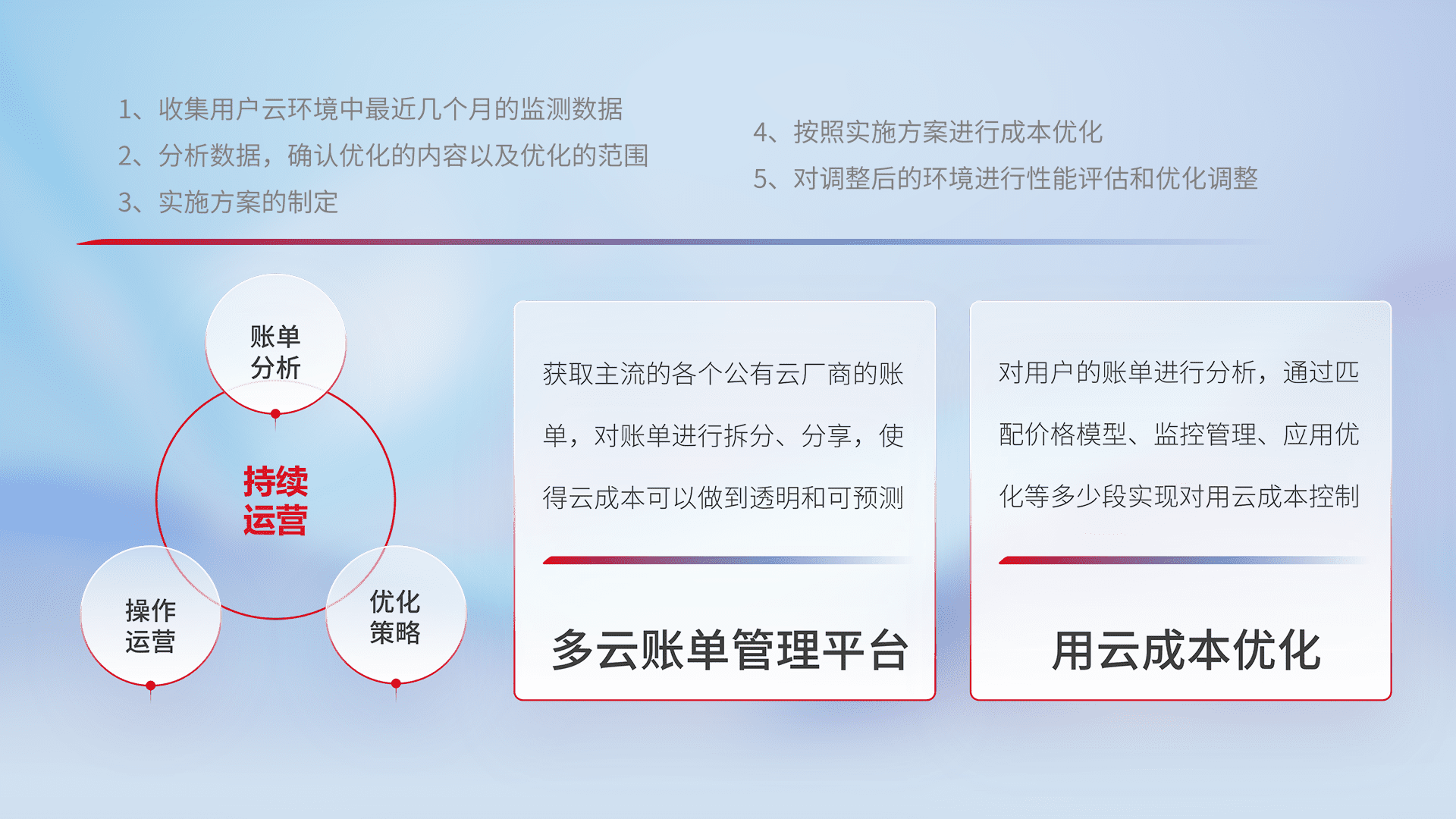 通过多云纳管,,,,以统一的资源数据模型把客户的云资源进行抽象和封装,,,,进而实现对多云资源的统一操作,,保障云资源管理的可靠性、、、、稳定性与可用性。。量身定制化运维内容,,,,配置、、、、开发运维、、、补丁管理、、、备份、、、监控、、认证和访问管理、、、审计和日常巡检等,,保障在用云过程中的可靠度,,,稳定度以及高可用率。。。